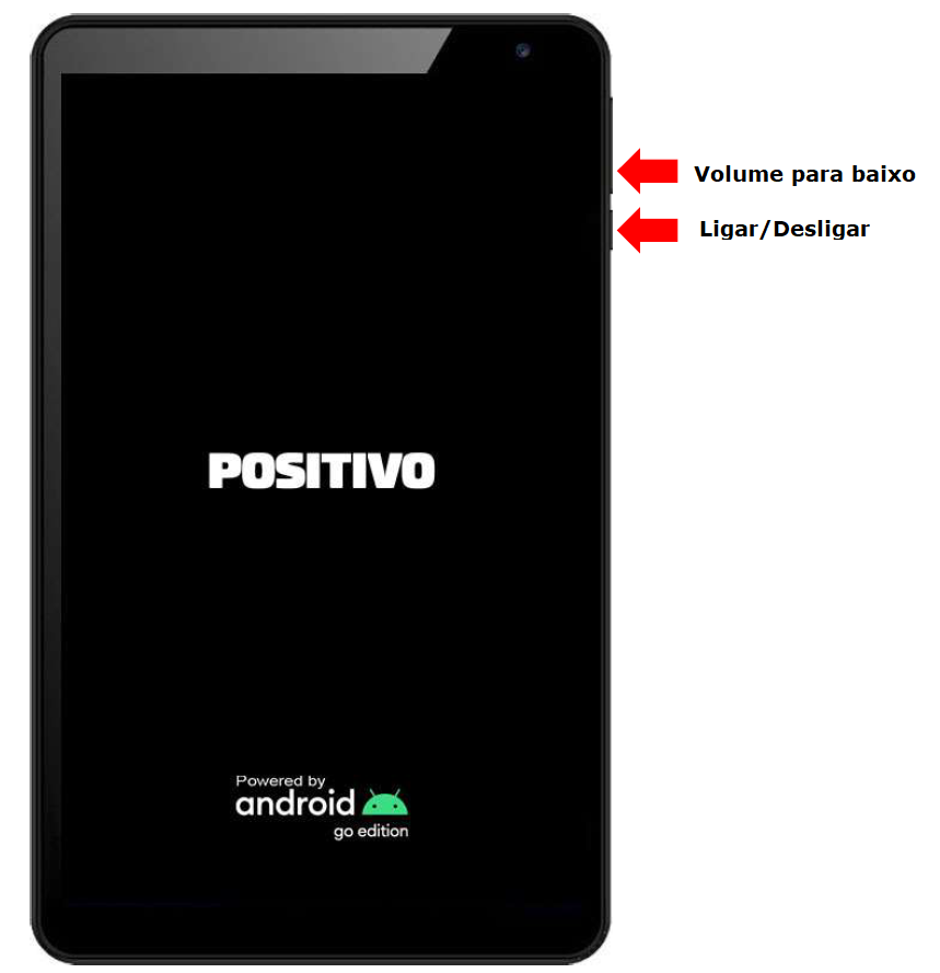 - 4 – Na tela do logotipo, solte o botão POWER, mantendo pressionado o botão VOLUME “-“, até aparecer a tela de