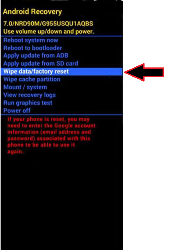 6 – Em seguida ainda utilizando as teclas de VOLUME “+” e “-“, selecione a opção FACTORY DATA RESET e confirme
