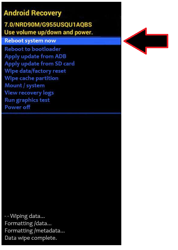 7 – Com o primeiro item do menu já marcado (REBOOT SYSTEM NOW), pressione o botão POWER para o aparelho